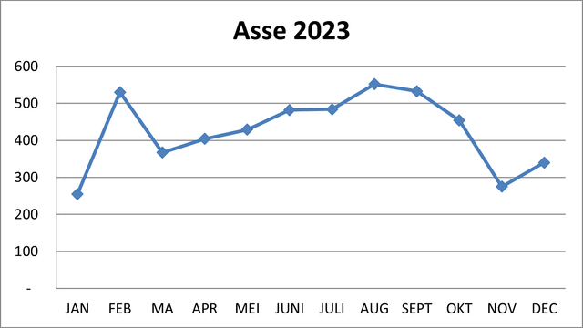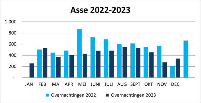 In 2023 mocht Asse 2.208 gasten verwelkomen. Zij waren samen goed voor 5.105 overnachtingen.