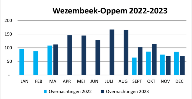 In 2023 mocht Wezembeek-Oppem 308 gasten verwelkomen. Zij waren samen goed voor 1.219 overnachtingen.