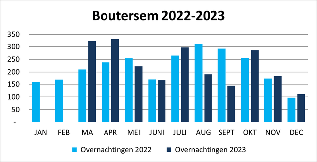 In 2023 mocht Boutersem 783 gasten verwelkomen. Zij waren samen goed voor 2.259 overnachtingen.