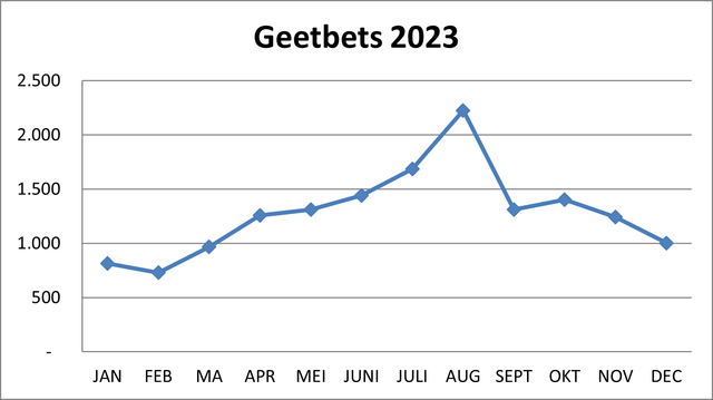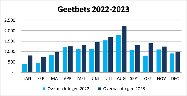 In 2023 mocht Geetbets 7.716 gasten verwelkomen. Zij waren samen goed voor 15.387 overnachtingen.