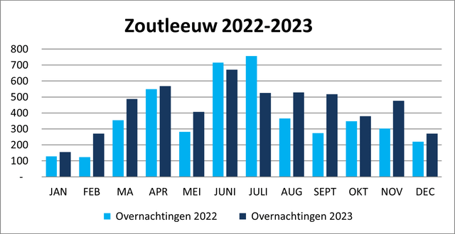 In 2023 mocht Zoutleeuw 2.109 gasten verwelkomen. Zij waren samen goed voor 5.257 overnachtingen.